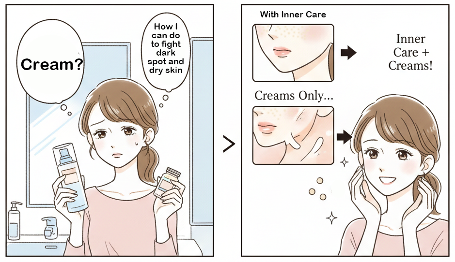 Back home, your skin was glowing. But in Japan, the air is dry, the water is different, and work stress is high. Have you noticed: