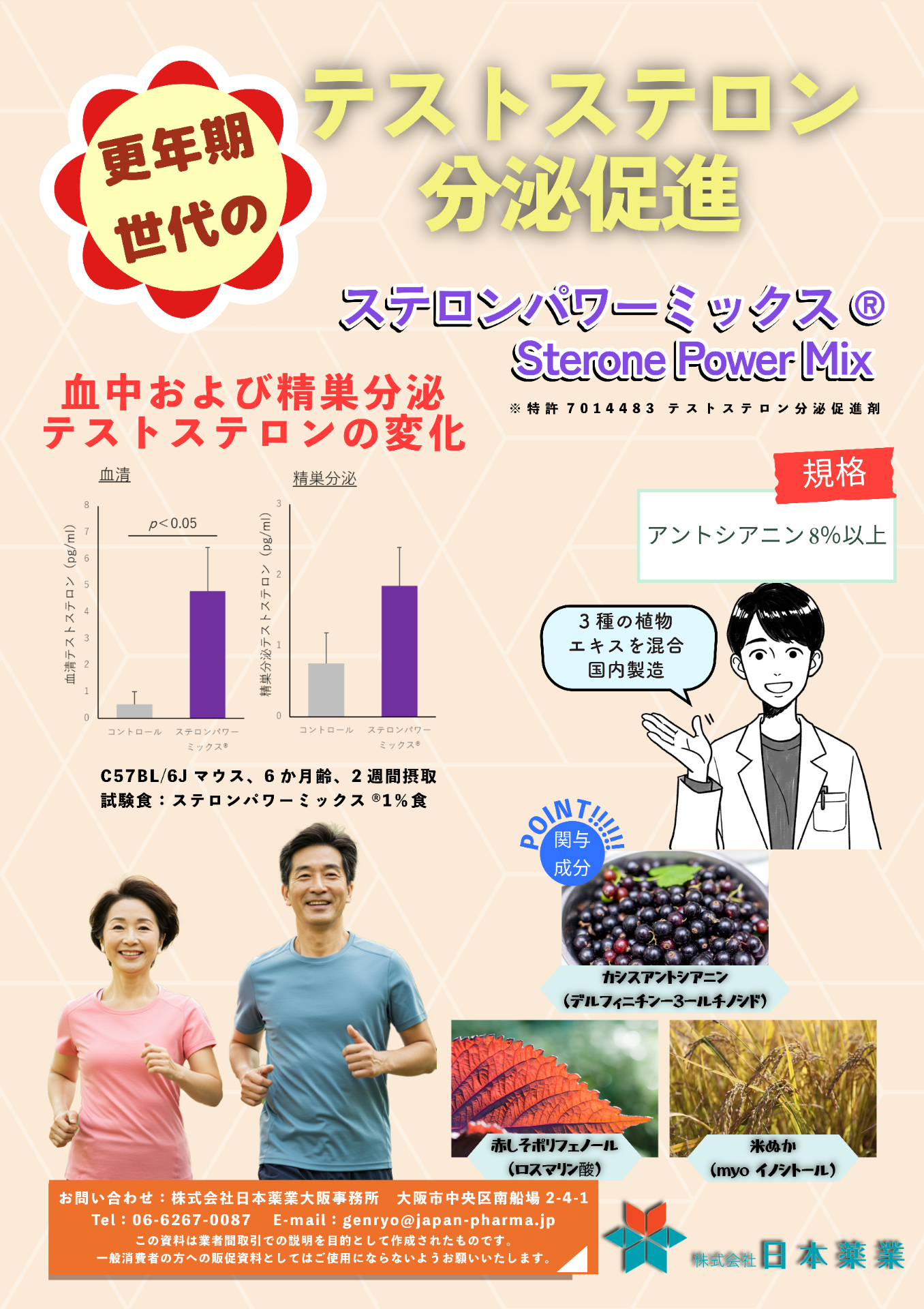ステロンパワーミックス®は培養細胞ではテストステロン分泌を促すことが分かっています。また加齢雄性マウスやヒト男性が飲用することでテストステロンが上昇することも分かりました。
