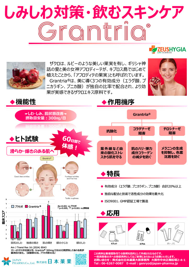 古くから「アフロディテの果実」として愛と美の象徴とされてきたザクロ。そのルビーのような輝きは、多くの人々を魅了し、美と健康のために珍重されてきましたそして今、私たちはこのザクロの秘めたる力を、最先端の科学と独自の技術で最大限に引き出した革新的な美容素材「Grantria®(グラントリア)」を、日本の皆様へお届けいたします。株式会社日本薬業は、「Grantria®」の日本における正規代理店として、内側から輝く「飲むスキンケア」の新常識をご紹介します。