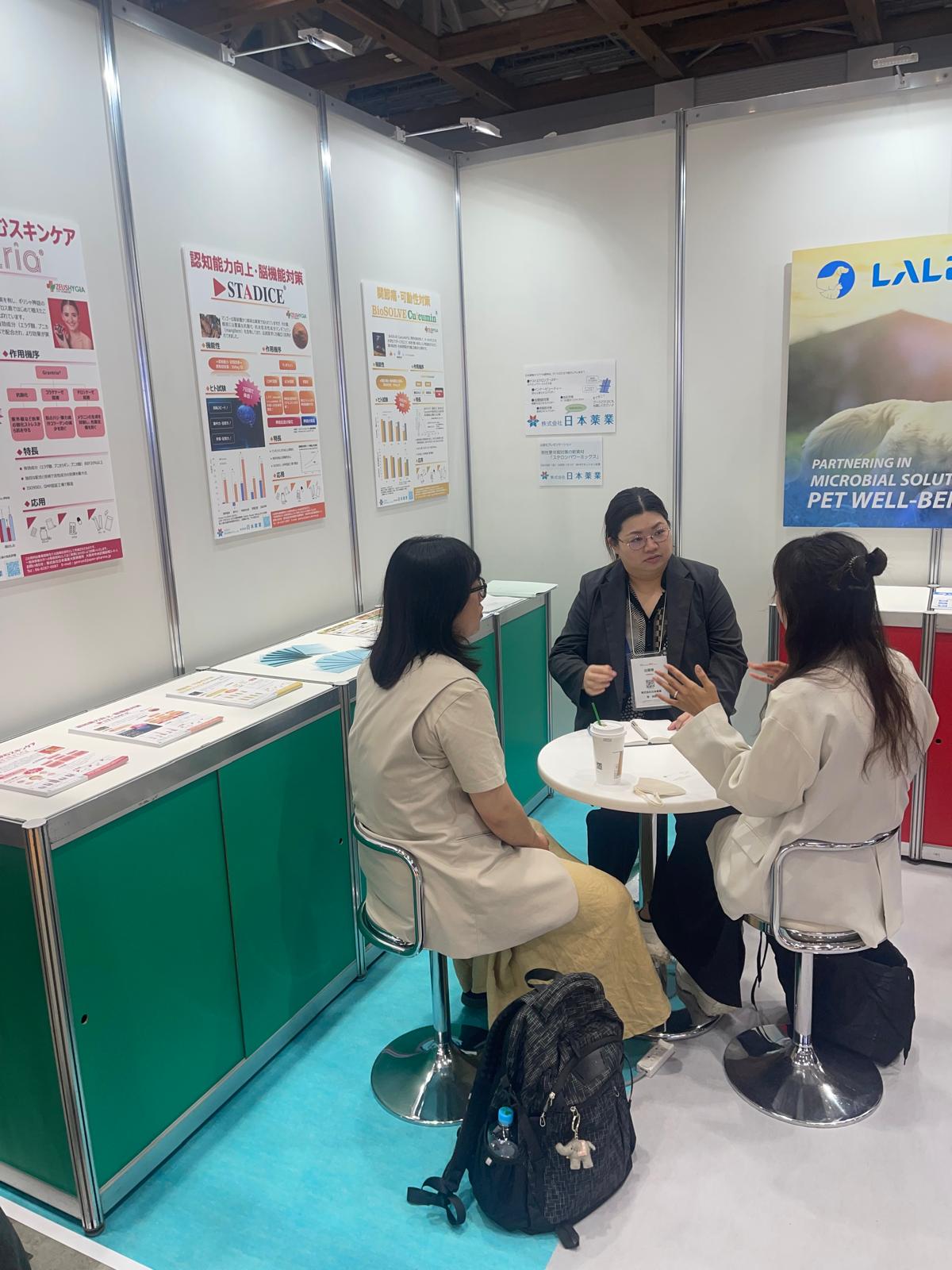 皆さん、弊社の原料サンプルを手に取り、その可能性について熱心に質問を投げかけてくださいました。「この原料はどんな商品に使えるの?」「安全性は?」「具体的な研究データは?」など、具体的な質問が多く、ビジネスに直結する手応えを感じることができました。