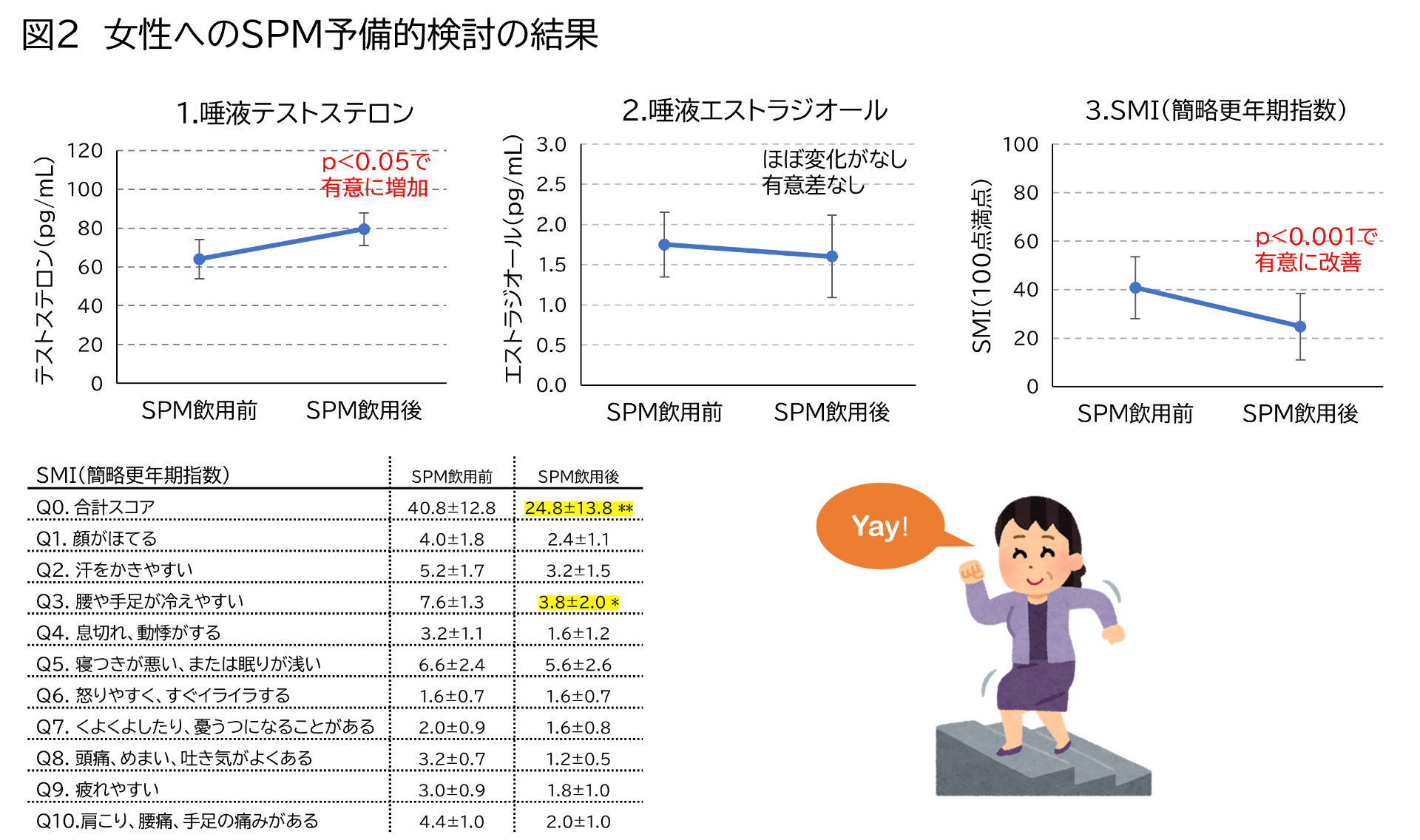 図2にその結果を示します。ステロンパワーミックス®(図中ではSPMと略しました)飲用前と比較して、飲用後で唾液テストステロンは有意に上昇しており、エストラジオールはわずかに減少傾向でほとんど変化がありません(この結果につきましては、日本農芸化学会2026でも発表スライドに加えました)。また、面白い事に飲用後にSMI総スコアが有意に低下(改善)しています(※SMIは、「症状が強い→ スコアが高い」ですので「症状が緩和 → スコアが低下」となります)。「テストステロン値が低い女性ほど、更年期症状が強く出やすい傾向がある」、とも言われておりますので、テストステロン量と女性更年期症状の強弱については、今後もより検討してみたいところです。